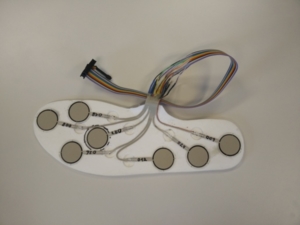 The SONIGait insoles are fitted with 7 A301 force sensors which are directly embedded into the shoe sole. These force sensors are located in the heel area and continue along the lateral part of the sole to the forefoot and metatarsophalangeal joints. This sensor arrangement allows for the calculation of several gait timing parameters as well as the rough approximation of the vertical ground reaction force and plantar force distribution.