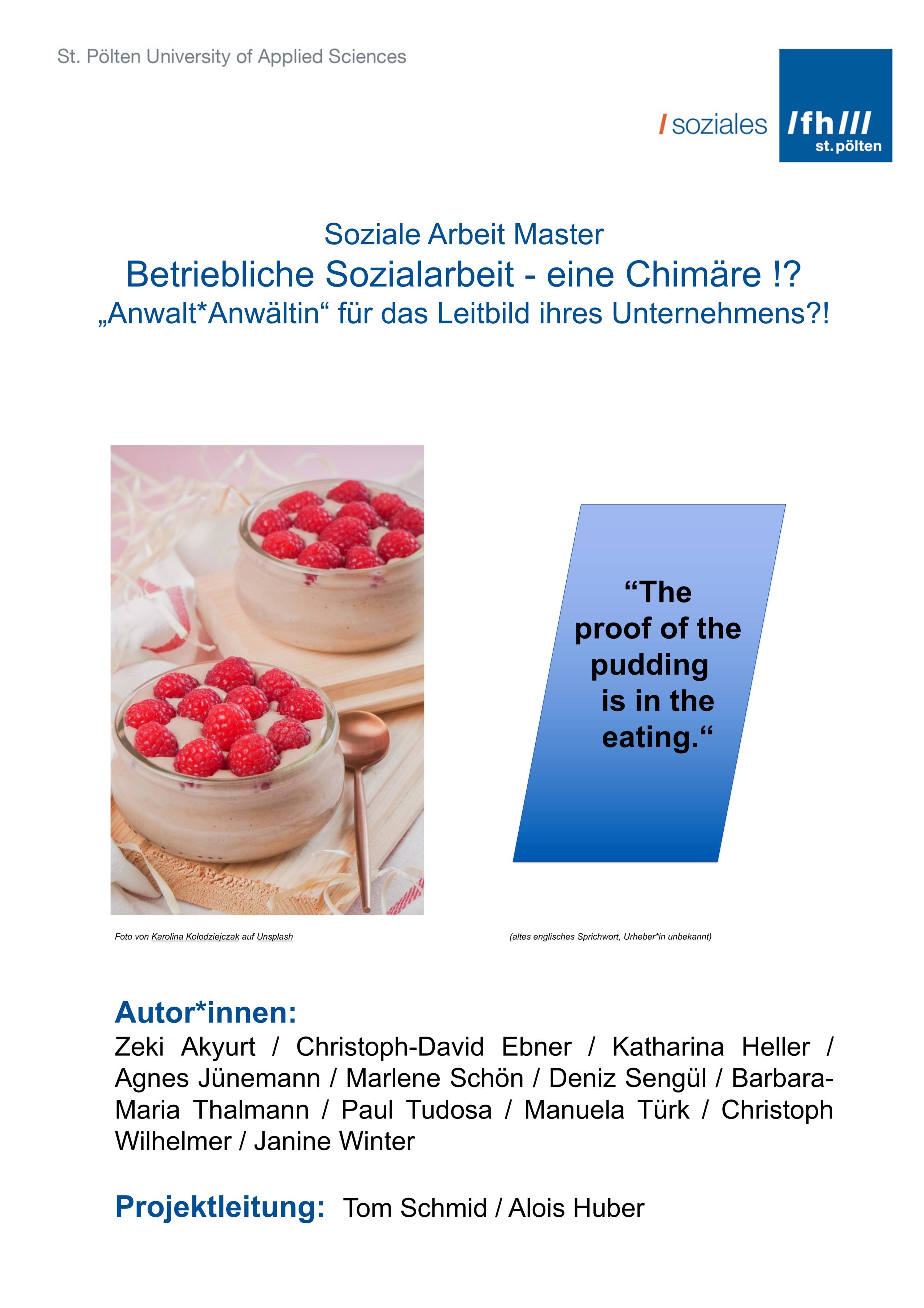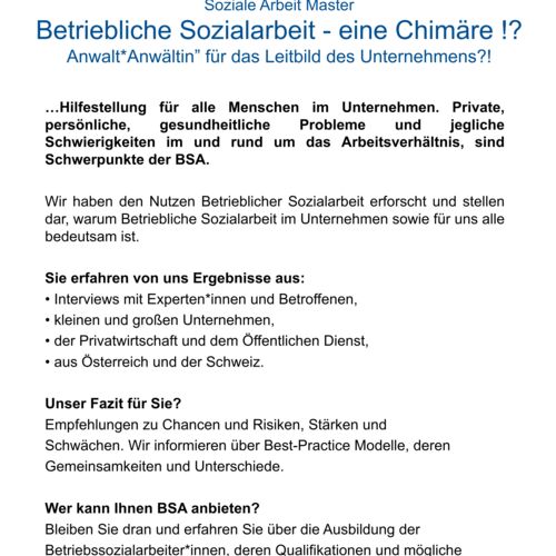Das Projekt beschäftigt sich mit dem Thema "Betriebliche Sozialarbeit" ("Employee Assistance Programs"). Idee ist die Generierung eines österreichweiten Überblicks über Betriebliche Sozialarbeit sowie die Erarbeitung von Best Practice-Beispielen. Der Überblick unter Einbeziehung des "Schweizer Modells" soll Aufschluss darüber geben, wo und in welchen Firmen Betriebliche Sozialarbeit in welchem Umfang eingesetzt wird. Weiters soll erarbeitet werden, mit welchem methodisch-fachlichem Vorgehen Betriebliche Sozialarbeit im Feld agiert.