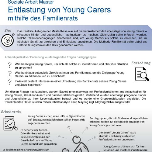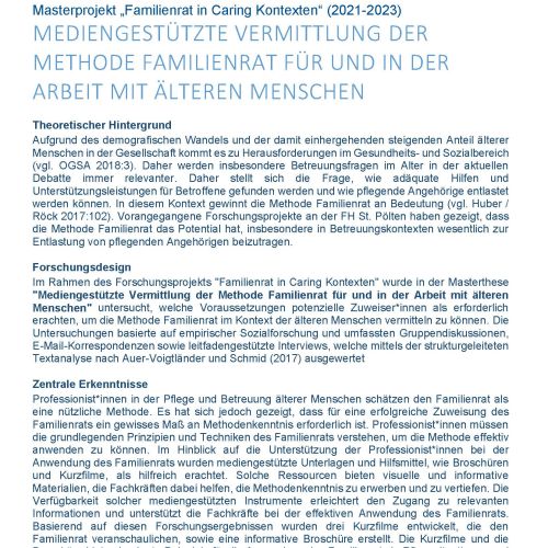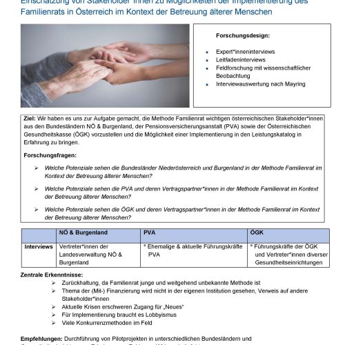 Die Methode Familienrat hat den Ergebnissen eines Vorgängerprojektes zufolge das Potential, insbesondere in Betreuungskontexten wesentlich zur Entlastung von Angehörigen beizutragen. Zudem wurde die Methode vom Bundesministerium für Arbeit, Soziales und Konsumentenschutz als geeignetes Instrument im Kontext von Young Carers genannt, um soziale und professionelle Ressourcen aufzudecken. Für eine breitflächigere, finanziell geförderte Ausrollung dieser Methode ist ein über Einzelfälle hinausgehender Nachweis über die unterstützende Wirksamkeit des Verfahrens erforderlich. Zudem bedarf es genauerer Erkenntnisse, welche Informationen und Unterstützungen potentielle Zuweiser*innen benötigen, um An- und Zugehörigen von älteren Menschen und auch Angehörigen von Young Carers dessen Potentiale vermitteln zu können.