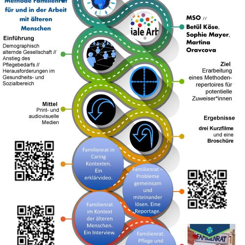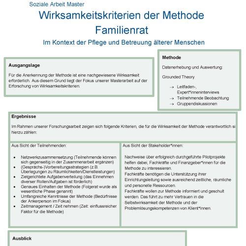 Ziele dieses Projektes sind daher 1.) sowohl für den Kontext der Betreuung älterer Menschen und den Kontext von Young Carers Kriterien zur Feststellung von Wirksamkeit bzw. Nichtwirksamkeit der Methode Familienrat zu definieren, 2.) Unterlagen zur Unterstützung von potentiellen Zuweiser*innen und Nutzer*innen des Familienrats in diesen Kontexten zu erarbeiten und 3.) das in einem Vorgängerprojekt entwickelte methodische Vorgehen im Betreuungskontext zu evaluieren. Insgesamt sollen damit weitere Schritte zur Konkretisierung der Umsetzung der Methode Familienrat im Kontext der Pflege und Betreuung älterer Menschen und im Bereich Young Carers gesetzt werden.