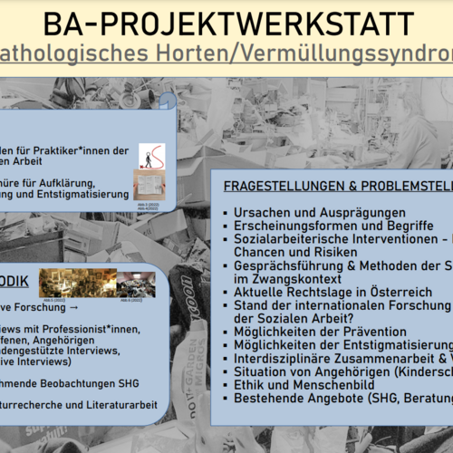 Darüber hinaus sind die Möglichkeiten und Fähigkeiten des*der Einzelnen für den Ablauf der Sozialen Arbeit entscheidend. Das Projekt beschäftigt sich daher mit den Ursachen und psychosozialen Begleiterscheinungen dieser Problematik sowie mit Strategien, Richtlinien oder der Erstellung eines Leitfadens für Praktiker*innen der Sozialen Arbeit. Dabei wird den Fragen nachgegangen, welche Interventionen maßgeblich an einer positiven Begleitung durch Soziale Arbeit hervorzuheben sind.