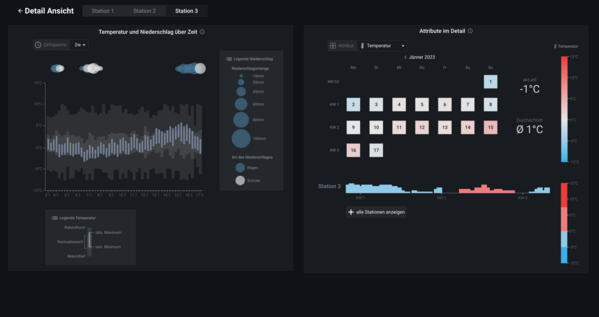 Im zweiten, finalen Prototyp wurden auch Detailseiten eingeführt, auf denen einzelne Datenattribute für jede Station detailliert betrachtet werden konnten. Dies ermöglichte den Nutzern, spezifische Wetterdaten für verschiedene Standorte genauer zu erkunden. Die Panele die hierfür angedacht sind waren zum einen das Min-Max Chart und zum anderen das Kalender Panel.