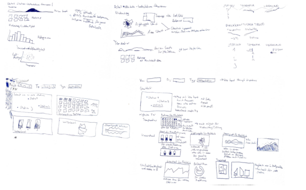 Der Designprozess begann mit handgezeichneten Skizzen, die verschiedene Layout- und Visualisierungsoptionen erforschten. Diese ersten Entwürfe bildeten die Grundlage des Dashboard-Prototyps und halfen dabei, unterschiedliche Ansätze zur klaren und benutzerfreundlichen Darstellung von Daten zu testen.