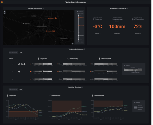 Diese Version enthielt eine weiterentwickelte Übersichtsseite mit einem Karten-Panel, Extremwert-Panel, Bulletgraph-Panel und Multi-Line-Diagrammen. Hier wurden auch „Small Multiples“-Visualisierungen verwendet, was im Bulletgraph-Panel gut ersichtlich ist. Im Grunde war dies bereits die finale Version des Click-Dummy-Prototyps, mit der auch die Nutzerstudien durchgeführt wurden und auf deren Basis die fertigen Grafana-Panels entwickelt wurden.