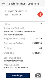 Über die Auftragsnummer erhält eine mobile App sämtliche Infos zu Montageschritten eines Auftrags (also nicht nur Sonderfälle). Diese werden als Liste aufbereitet und bieten eine Checklisten-Funktionalität. Damit hat der Mitarbeiter bereits einen Mehrwert gewonnen, den er bislang nicht hatte: Er kann (optional) jeden getätigten Montageschritt in einer mobilen Anwendung abhaken und damit eine Übersicht über den bisherigen Fortschritt gewinnen.