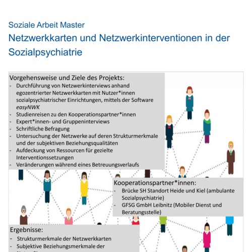 Das Forschungsprojekt widmete sich der qualitativen Analyse von sozialen Beziehungen und sozialen Netzwerken von Nutzer*innen der beiden sozialpsychiatrischen Einrichtungen Brücke SH (Schleswig-Holstein, D) und der Gesellschaft zur Förderung seelischer Gesundheit (Steiermark, A). Das Vorhaben zu untersuchen, wie sich das soziale Beziehungsgefüge dieser Nutzer*innen im Verlauf der professionellen Betreuung verändert, konnte aufgrund der Restriktionen durch die COVID-19-Pandemie nicht umgesetzt werden. Basierend auf 47 Netzwerkinterviews und Netzwerkkarten, 40 schriftlichen Befragungen, sieben Expert*inneninterviews und drei Gruppendiskussionen konnten dennoch differenzierte Fragestellungen bearbeitet werden. Neben einer ausführlichen theoretischen Auseinandersetzung mit sozialen Netzwerken, sozialem Kapital, sozialer Unterstützung, sozialer Netzwerkforschung und Netzwerkdiagnostik bietet die Masterarbeit Erkenntnisse zu folgenden Themen: