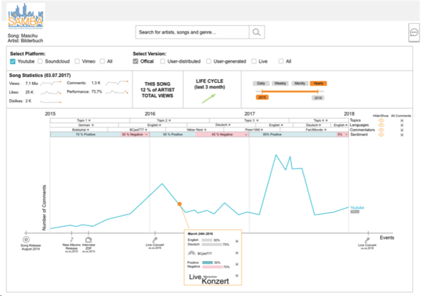 Erste Modelle des Social Media Monitoring Tools SAMBA wurden veröffentlicht. Das folgende Modell zeigt die grundlegenden Funktionen des Tools: Nach einer Suchanfrage nach Interpreten, Songs oder Genres können bestimmte Releases ausgewählt werden. Für diese Veröffentlichungen wird die Anzahl der Kommentare auf verschiedenen Social-Media-Plattformen im Laufe der Zeit angezeigt. Der Kern des Tools ist die Zusammenfassung der Ergebnisse aus dem Text Mining. Besonderes Augenmerk wird auf die Interaktivität und Transparenz der zugrunde liegenden Informationen gelegt. Der Social-Media-Lebenszyklus einer Songveröffentlichung kann somit von den Künstlern und Managern detailliert verstanden werden.