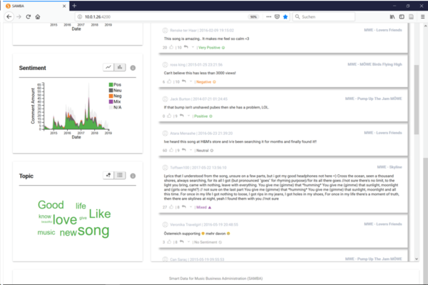 In der zweiten Jahreshälfte 2018 wurde ein voll funktionsfähiger Prototyp des Song Life Cycles Analysis Tools (derzeit nur für YouTube) programmiert. Die folgenden Abbildungen zeigen die verschiedenen Funktionen der Benutzeroberfläche in zwei Screenshots (eine öffentliche Online-Version wird Ende 2019 veröffentlicht). Sie zeigen die Suchfunktion und die Hauptvisualisierungen der Zeitreihen.