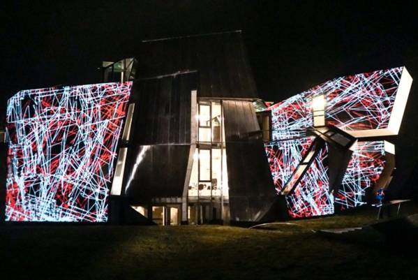 Videomapping Projekt auf der Fassade des Steinhaus Domenig im Rahmen des Wahlpflichtfachs Experimentelle Medien Werkstatt im Wintersemester 2015/2016