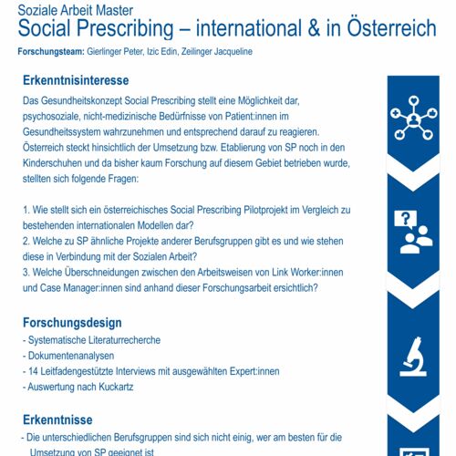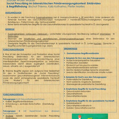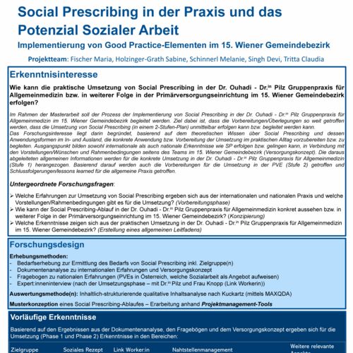 Das Projekt erforscht den internationalen Stand zu Social Prescribing und entwickelt Umsetzungsideen für eine Anwendung in Österreich, ausgehend von unterschiedlichen spezifischen Kontexten.