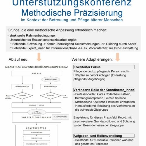 Die im Praxisfeld der Betreuung älterer Menschen und ihrer Angehörigen kaum vertretene Profession Soziale Arbeit sowie die fehlende Einbettung des Verfahrens in vorhandene Angebotsstrukturen machen methodische Anpassungen erforderlich. Dazu kommt, dass im Unterschied zum Bereich der Jugendwohlfahrt Familien von keiner Stelle dazu verpflichtet werden können, eine Unterstützungskonferenz in Anspruch zu nehmen. Die Entscheidung für eine Inanspruchnahme basiert ausschließlich auf Freiwilligkeit. Ein entscheidendes Kriterium für das Gelingen einer Unterstützungskonferenz ist – wie die Forschung gezeigt hat – eine umfassende Abklärung der Situation (Clearing) im Vorfeld einer Unterstützungskonferenz.