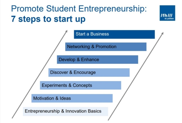 Ihre zahlreichen Aktivitäten zur Förderung von unternehmerischem Denken und Handeln bei Studierenden bündelt die USTP – University of Applied Sciences St. Pölten in ihrem Modell der "7 steps to start-up".